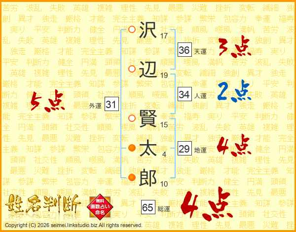 沢(17画)辺(19画) 賢(15画)太(4画)郎(10画)