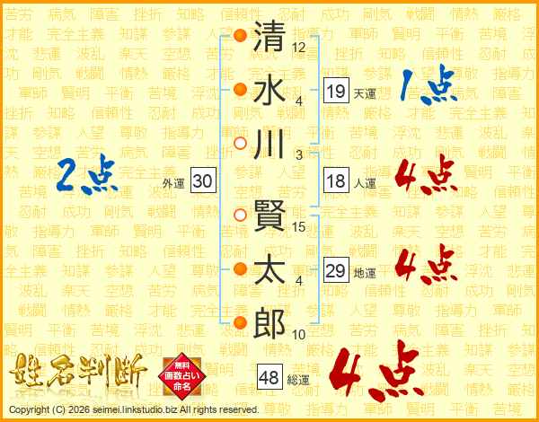 清(12画)水(4画)川(3画) 賢(15画)太(4画)郎(10画)