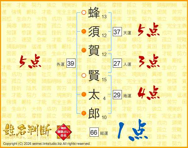 蜂(13画)須(12画)賀(12画) 賢(15画)太(4画)郎(10画)
