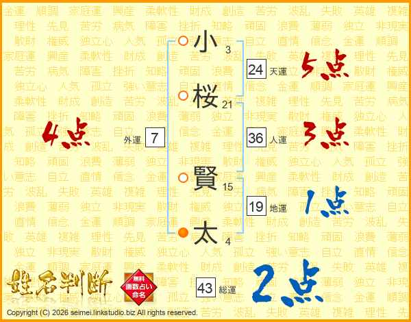 小(3画)桜(21画) 賢(15画)太(4画)