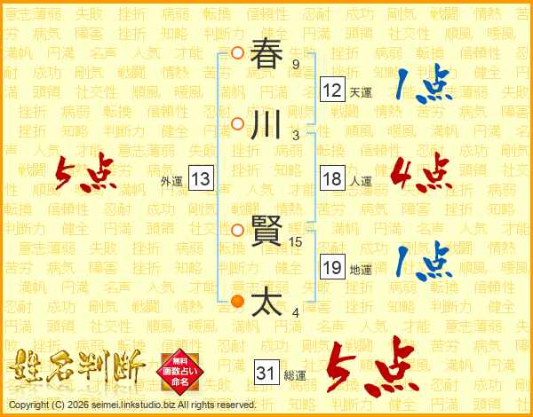 あなたの人生を表す1番重要な運勢です。生涯を通じて影響する総合運となり、主に50歳以降の晩年期に影響を及ぼします。苗字と名前の合計画数。