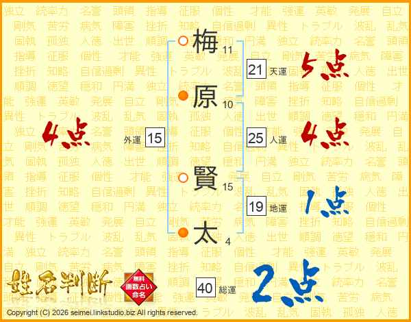 梅(11画)原(10画) 賢(15画)太(4画)