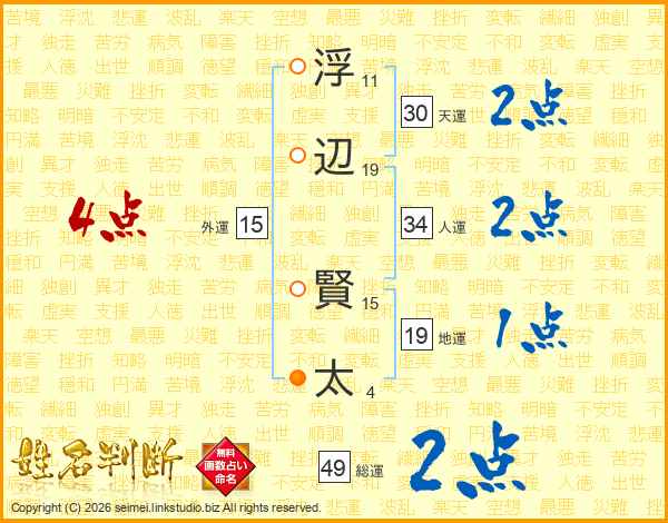 浮(11画)辺(19画) 賢(15画)太(4画)