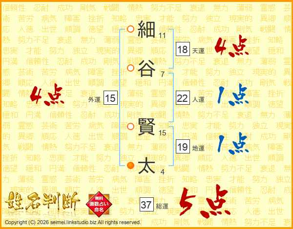 あなたの人生を表す1番重要な運勢です。生涯を通じて影響する総合運となり、主に50歳以降の晩年期に影響を及ぼします。苗字と名前の合計画数。