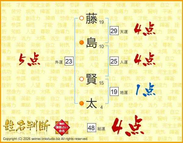 藤(19画)島(10画) 賢(15画)太(4画)