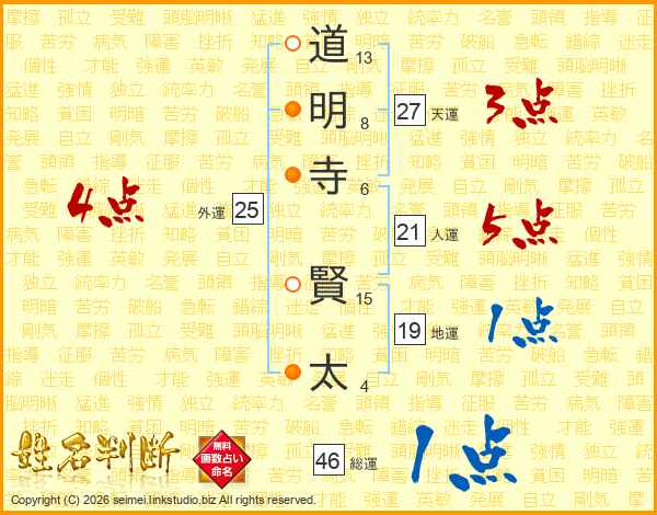 道(13画)明(8画)寺(6画) 賢(15画)太(4画)