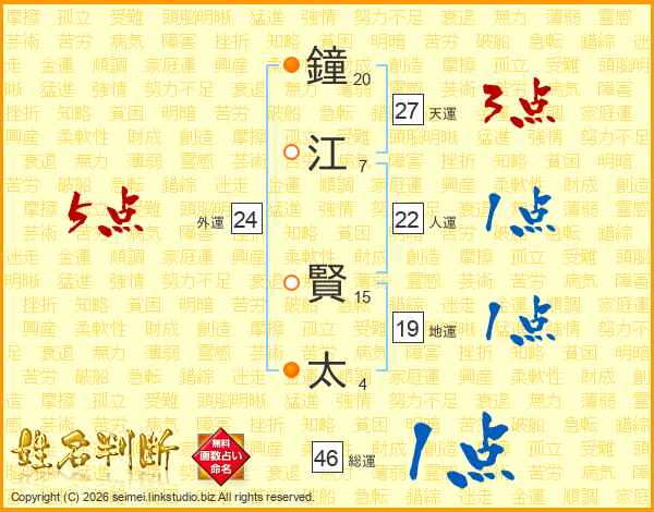 鐘(20画)江(7画) 賢(15画)太(4画)