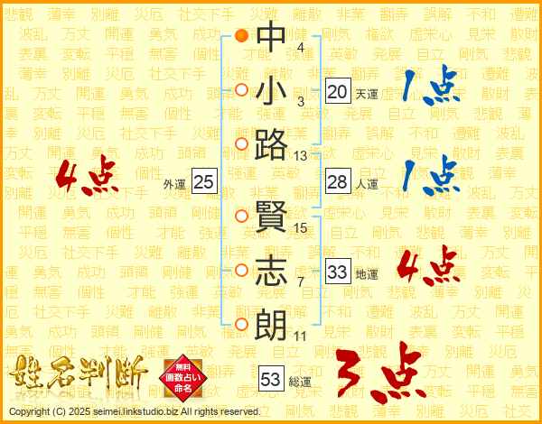 中(4画)小(3画)路(13画) 賢(15画)志(7画)朗(11画)