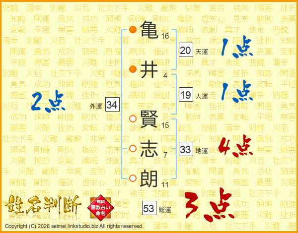 亀(16画)井(4画) 賢(15画)志(7画)朗(11画)