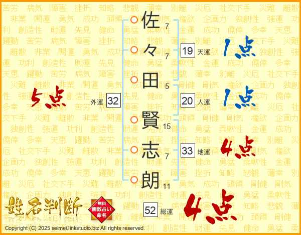 佐(7画)々(7画)田(5画) 賢(15画)志(7画)朗(11画)