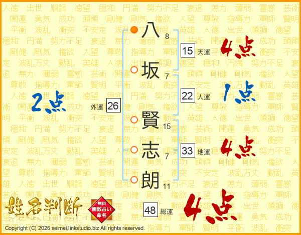 八(8画)坂(7画) 賢(15画)志(7画)朗(11画)