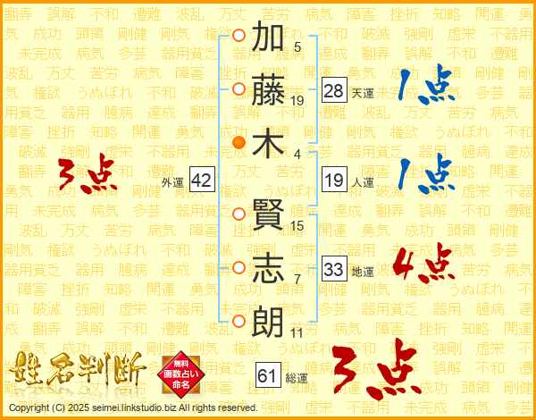 加(5画)藤(19画)木(4画) 賢(15画)志(7画)朗(11画)