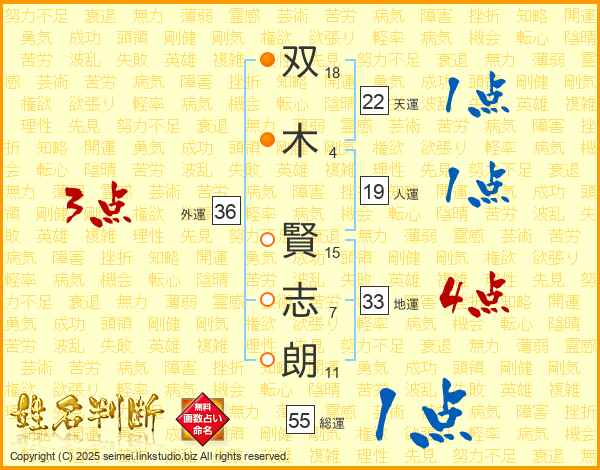 双(18画)木(4画) 賢(15画)志(7画)朗(11画)