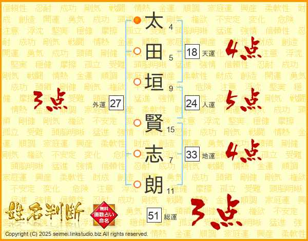 太(4画)田(5画)垣(9画) 賢(15画)志(7画)朗(11画)