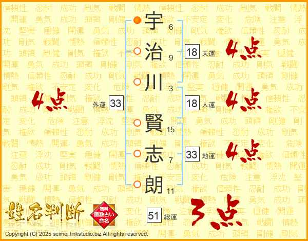 宇(6画)治(9画)川(3画) 賢(15画)志(7画)朗(11画)