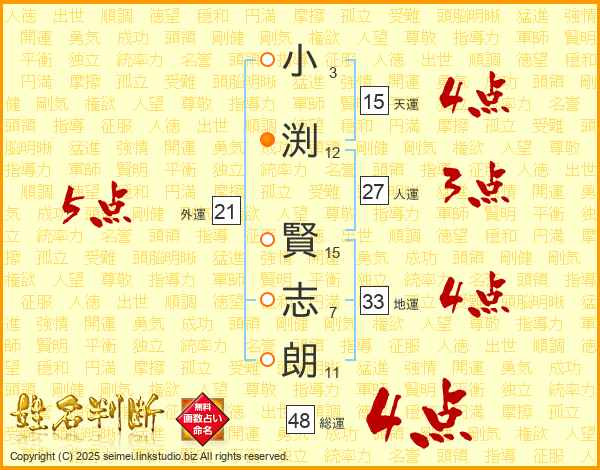 小(3画)渕(12画) 賢(15画)志(7画)朗(11画)