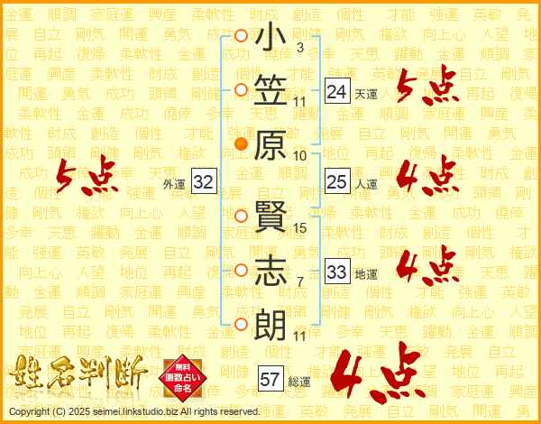 小(3画)笠(11画)原(10画) 賢(15画)志(7画)朗(11画)