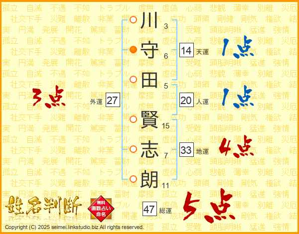 川(3画)守(6画)田(5画) 賢(15画)志(7画)朗(11画)