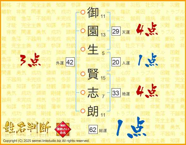 御(11画)園(13画)生(5画) 賢(15画)志(7画)朗(11画)