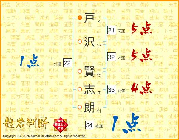 戸(4画)沢(17画) 賢(15画)志(7画)朗(11画)
