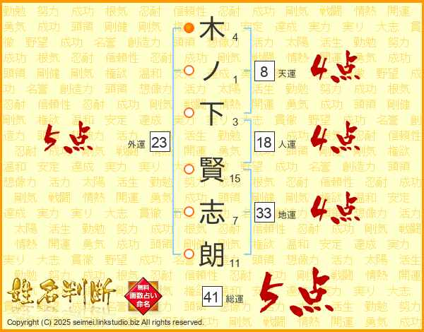 木(4画)ノ(1画)下(3画) 賢(15画)志(7画)朗(11画)