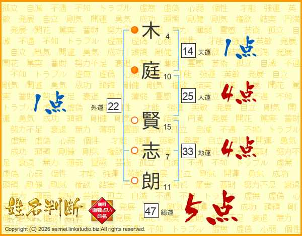 木(4画)庭(10画) 賢(15画)志(7画)朗(11画)