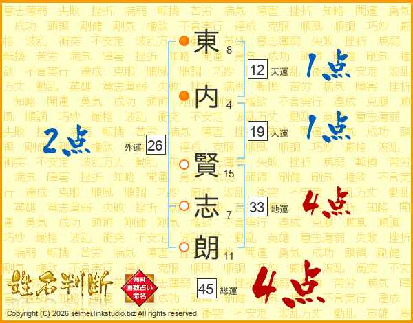 東(8画)内(4画) 賢(15画)志(7画)朗(11画)