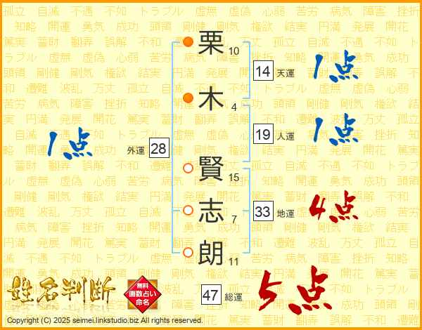 栗(10画)木(4画) 賢(15画)志(7画)朗(11画)