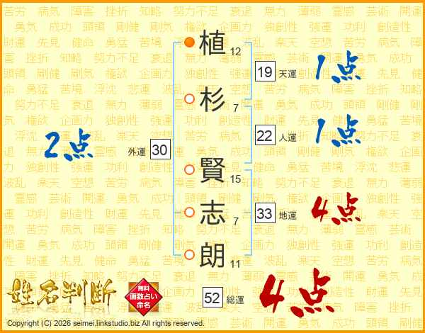 植杉賢志朗さんの総運は52画の4点!