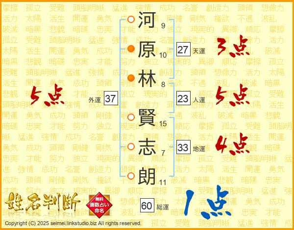 河(9画)原(10画)林(8画) 賢(15画)志(7画)朗(11画)