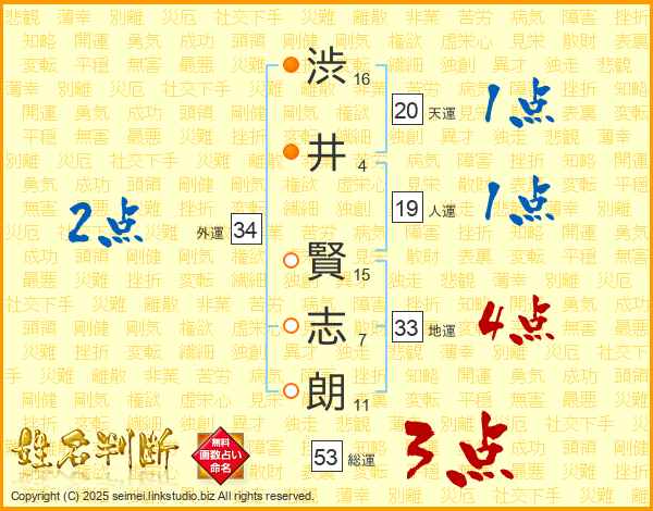 渋(16画)井(4画) 賢(15画)志(7画)朗(11画)