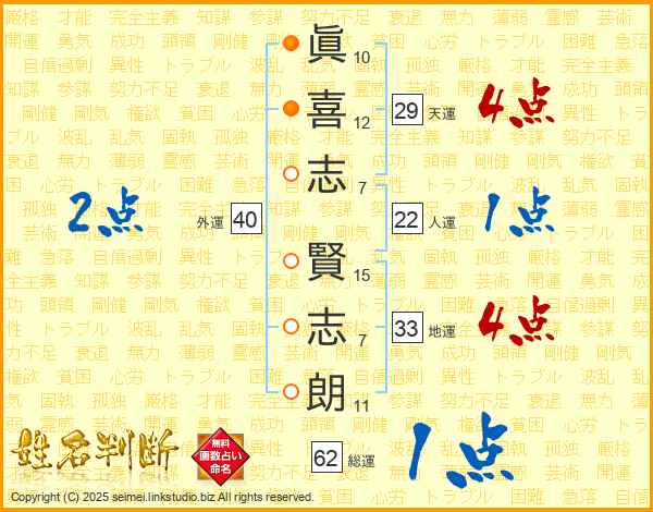 眞喜志賢志朗さんの天運は29画の4点!