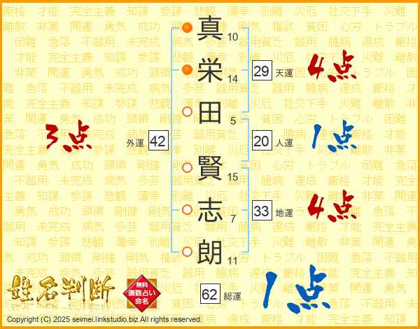 真(10画)栄(14画)田(5画) 賢(15画)志(7画)朗(11画)