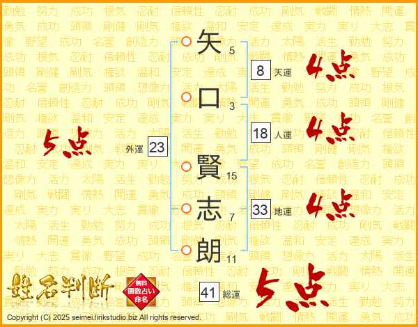 矢(5画)口(3画) 賢(15画)志(7画)朗(11画)