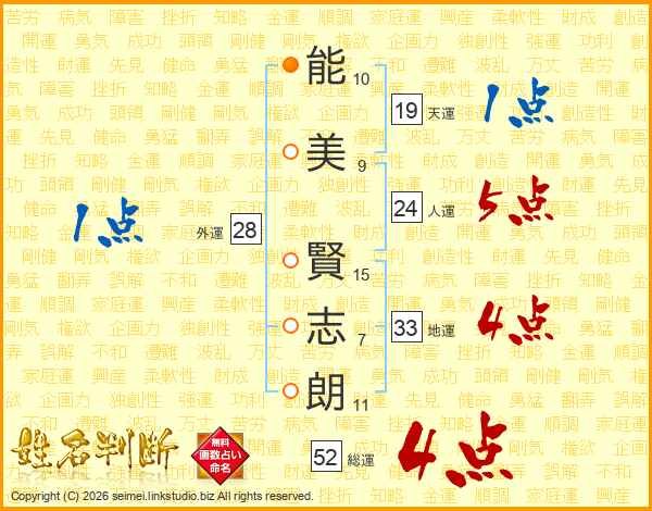 能(10画)美(9画) 賢(15画)志(7画)朗(11画)