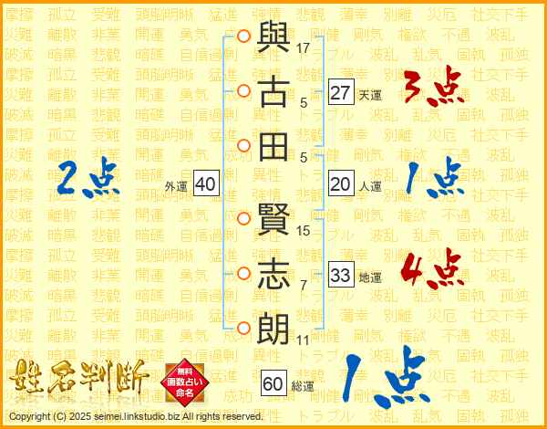 與(17画)古(5画)田(5画) 賢(15画)志(7画)朗(11画)