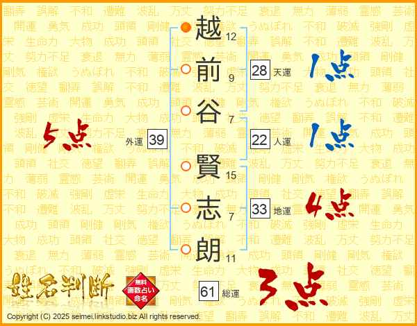越(12画)前(9画)谷(7画) 賢(15画)志(7画)朗(11画)