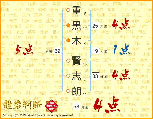重(9画)黒(12画)木(4画) 賢(15画)志(7画)朗(11画)