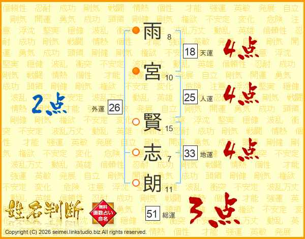雨宮賢志朗さんの人運は25画の4点!