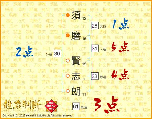 須(12画)磨(16画) 賢(15画)志(7画)朗(11画)