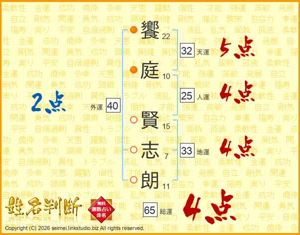 饗庭賢志朗さんの総運は65画の4点!