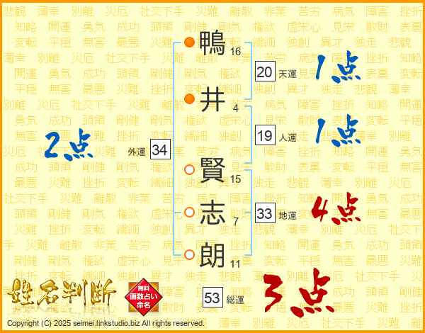 鴨(16画)井(4画) 賢(15画)志(7画)朗(11画)