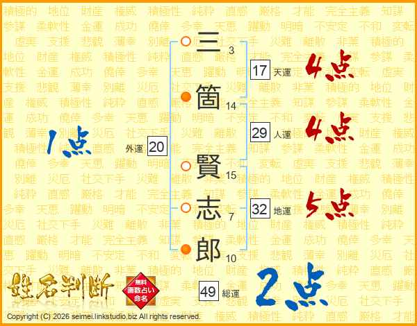 三(3画)箇(14画) 賢(15画)志(7画)郎(10画)