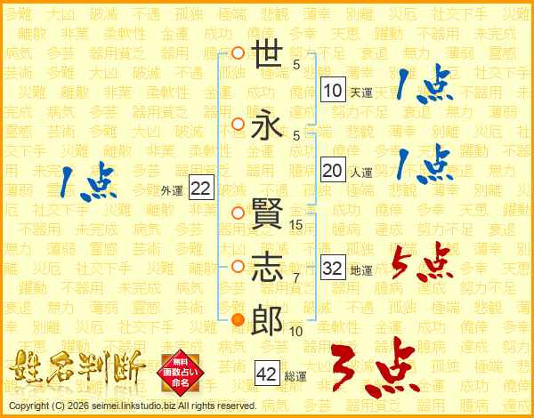 世(5画)永(5画) 賢(15画)志(7画)郎(10画)