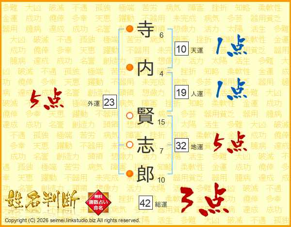 寺(6画)内(4画) 賢(15画)志(7画)郎(10画)