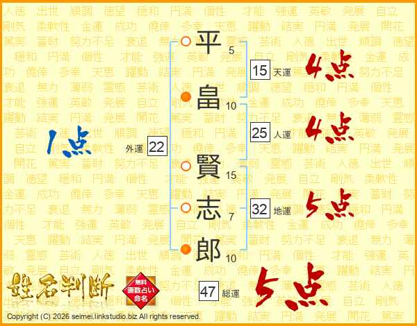 平(5画)畠(10画) 賢(15画)志(7画)郎(10画)