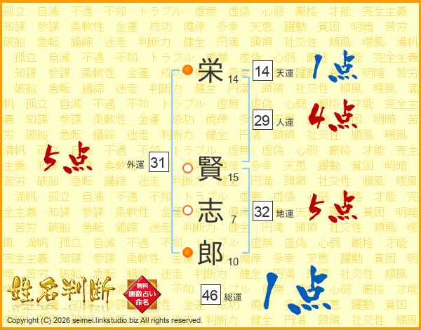 栄(14画) 賢(15画)志(7画)郎(10画)