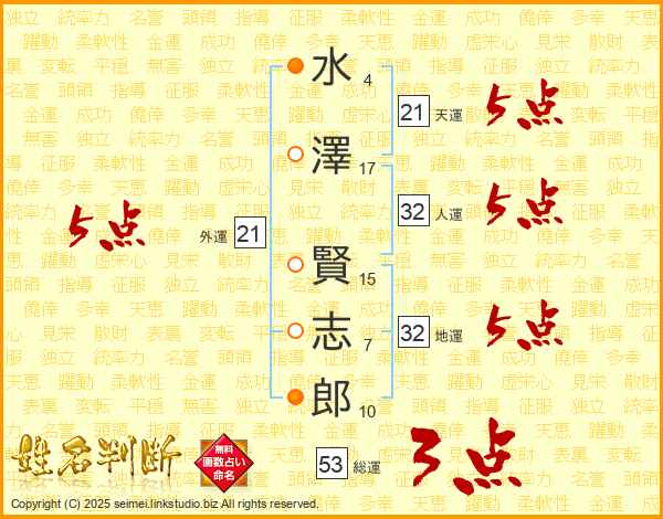 水(4画)澤(17画) 賢(15画)志(7画)郎(10画)