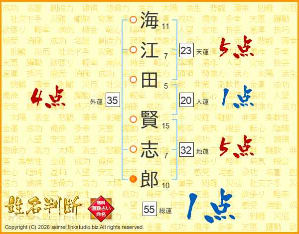 海(11画)江(7画)田(5画) 賢(15画)志(7画)郎(10画)