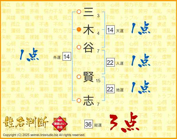 三(3画)木(4画)谷(7画) 賢(15画)志(7画)